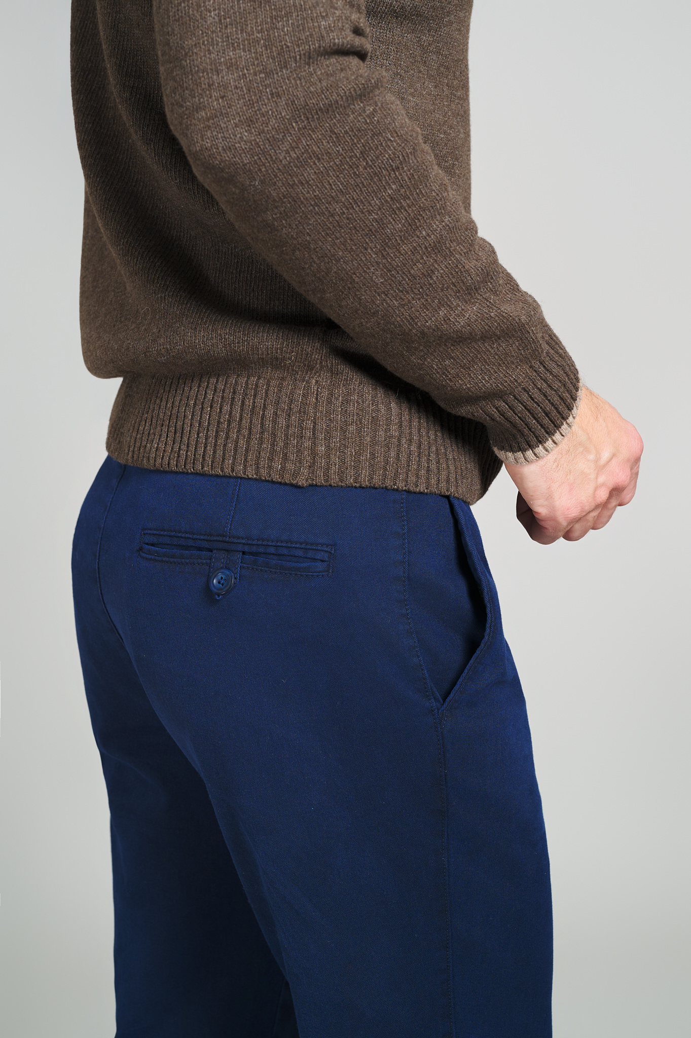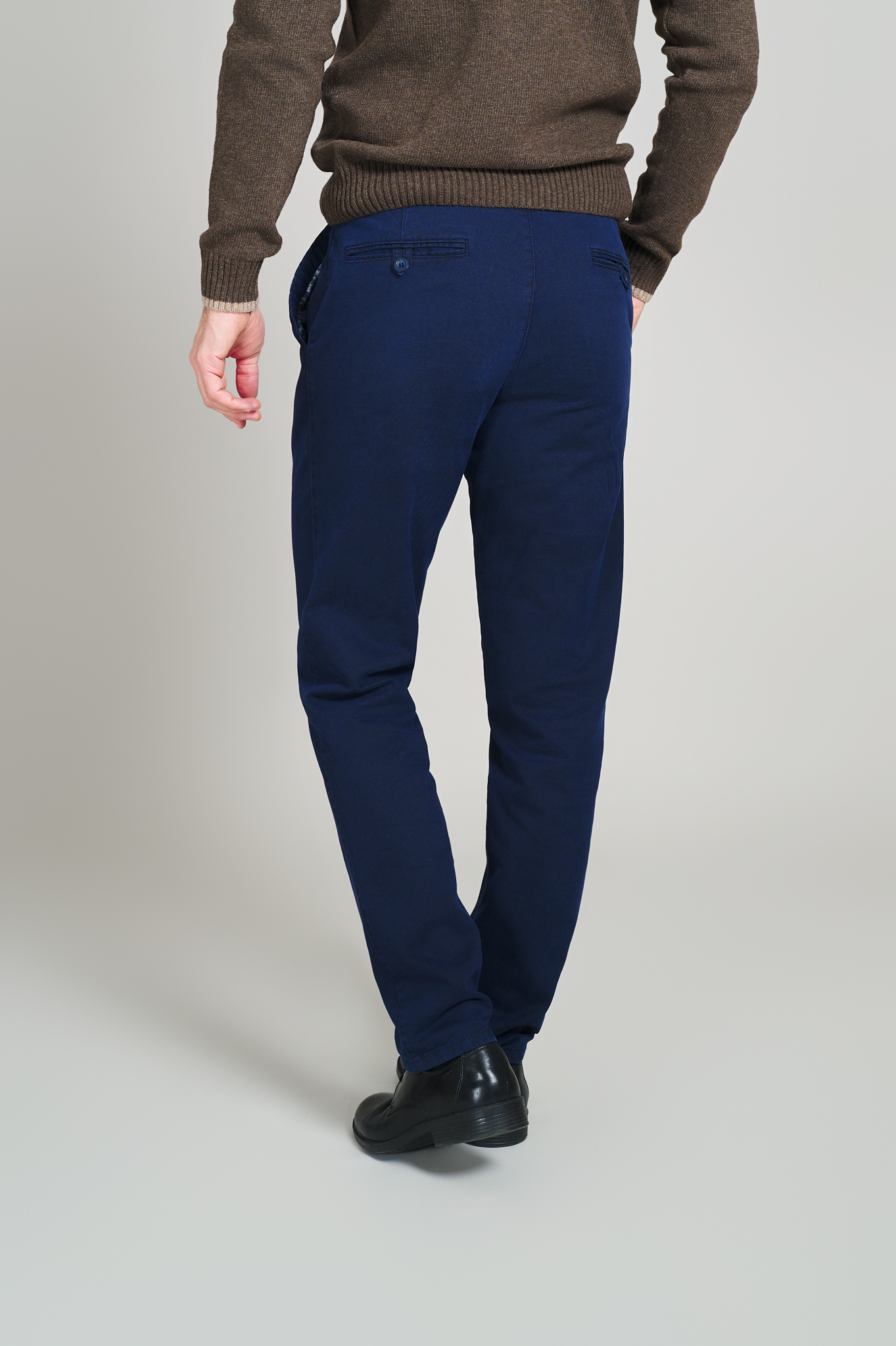 Pantaloni casual bleumarin, modern-fit, din țesătură naturală de lână, cu 4 buzunare clasice. Lățime terminație-tiv(masura 50): 19 cm.