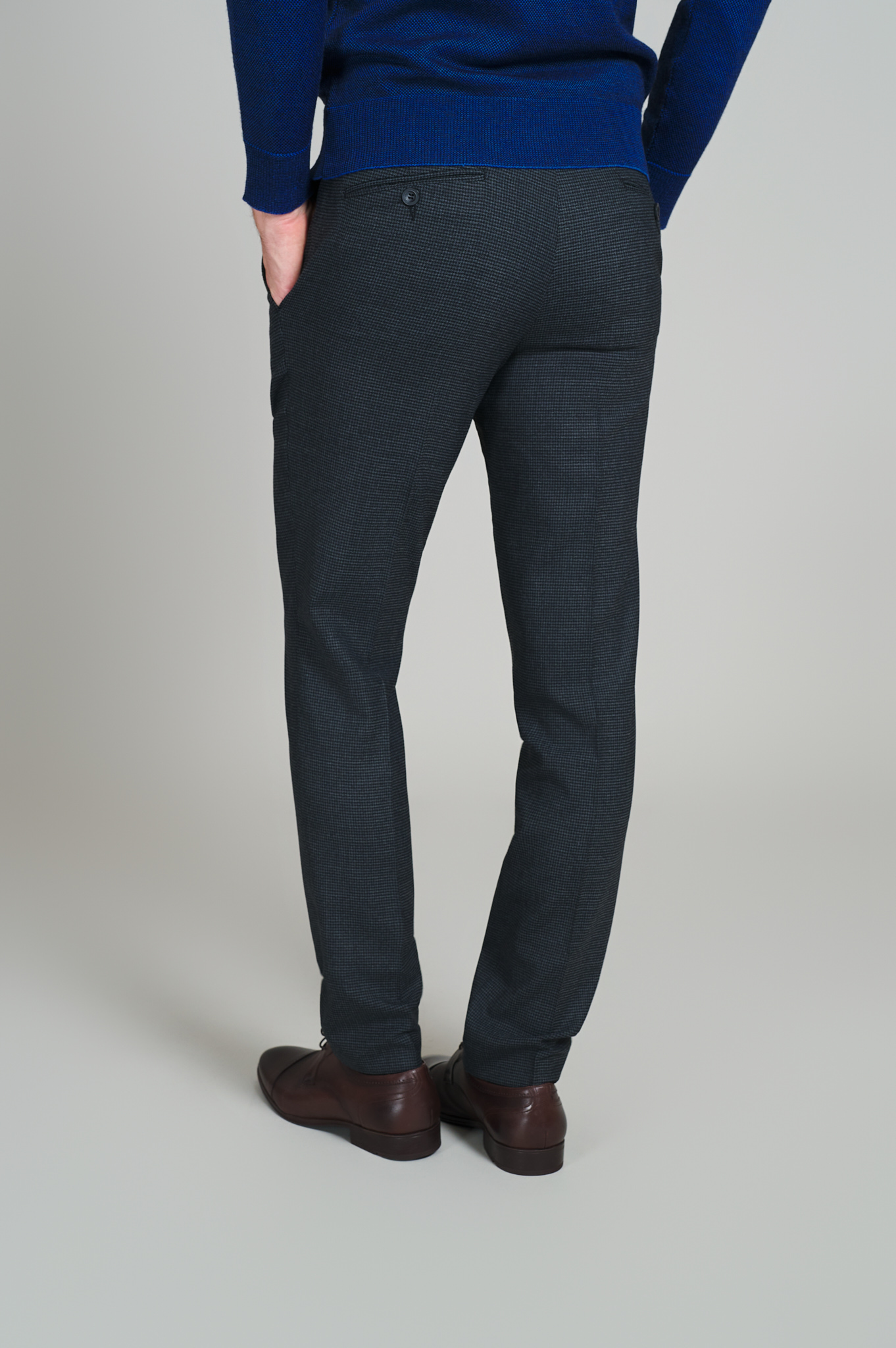 Pantaloni clasici slim-fit realizat din țesătură cu compoziție de polyester, lana si elastan, cu betelie tip stop cămașă, cu 4 buzunare clasice. Lățime terminație-tiv(masura 50):18,5 cm.