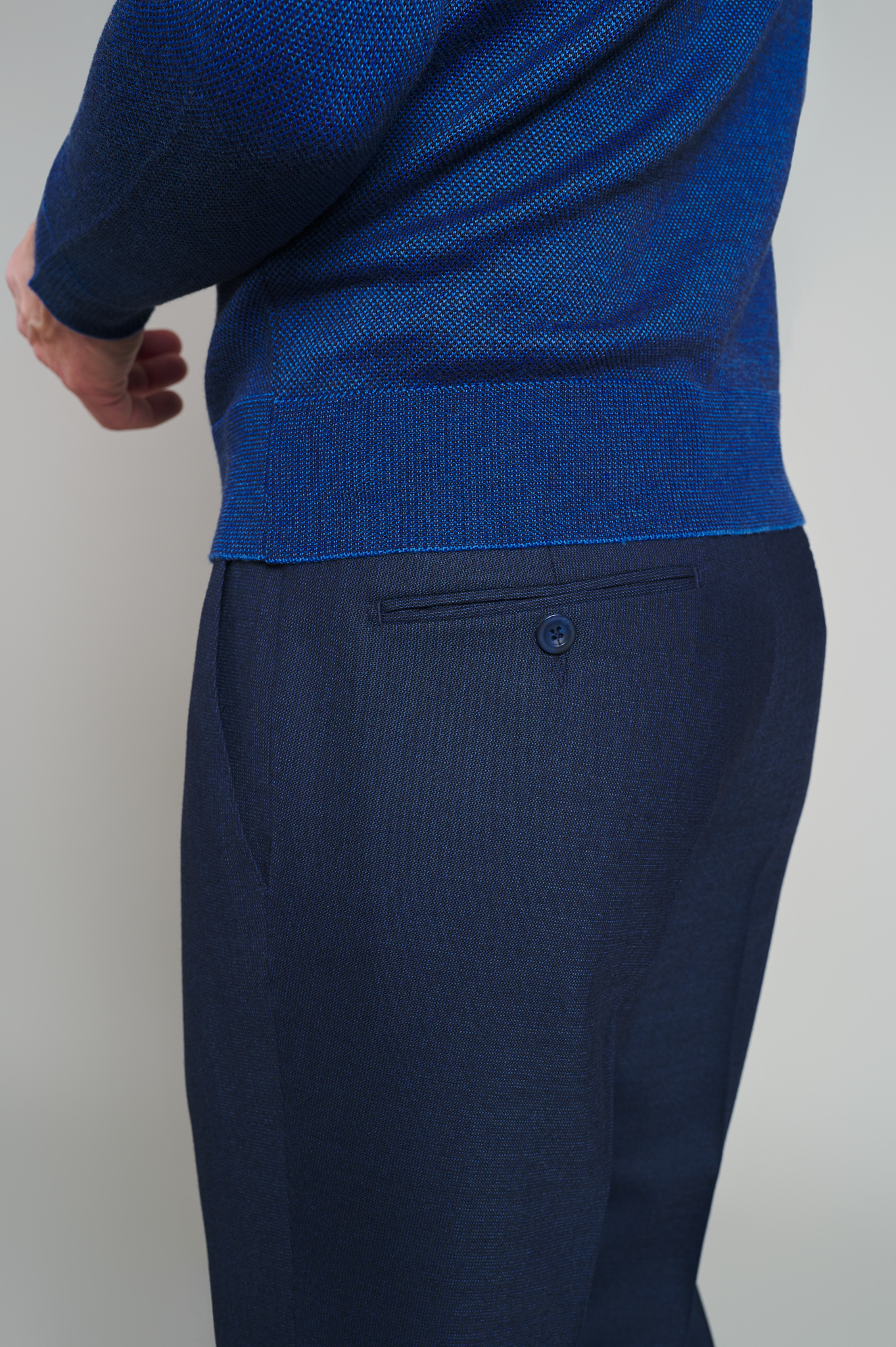 Pantaloni clasici slim-fit realizat din țesătură cu compoziție de polyester, lana si elastan, cu betelie tip stop cămașă, cu 4 buzunare clasice. Lățime terminație-tiv(masura 50):18,5 cm.