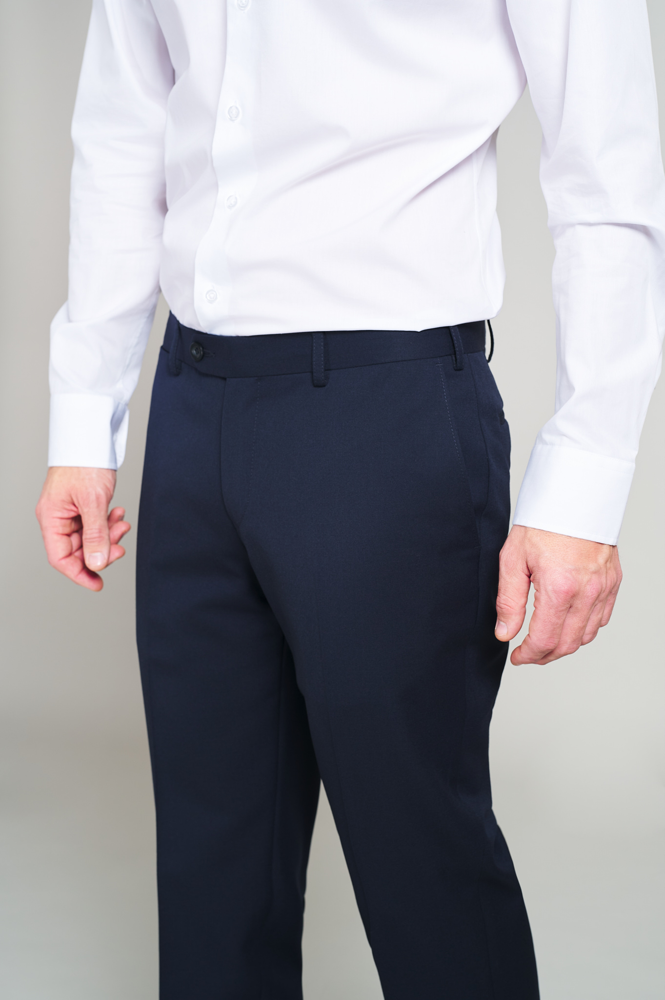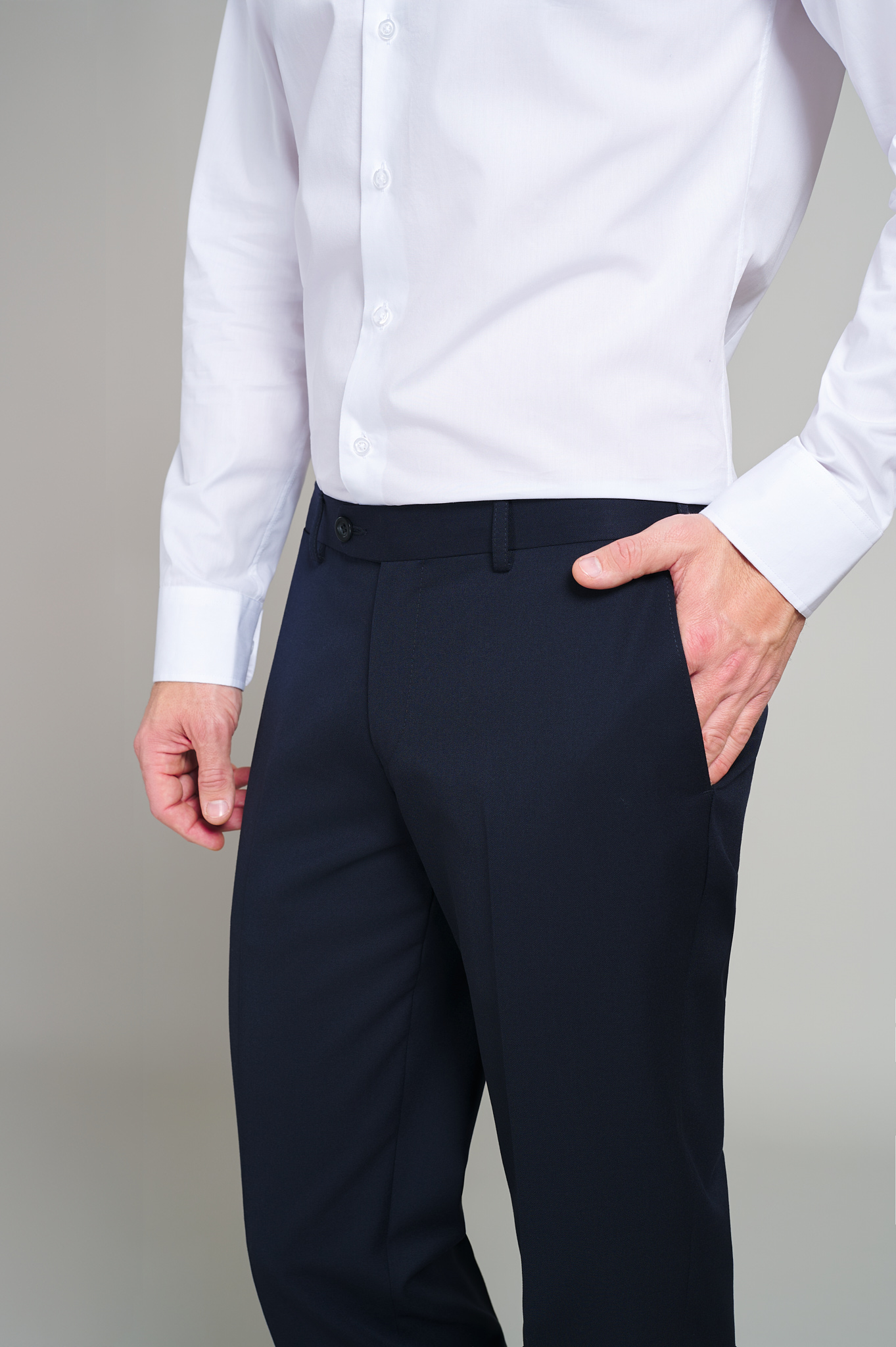 Pantaloni clasici Flavio bleumarin, cu statură clasică. Patru buzunare clasice față-spate ,betelie tip stop cămașă ce ajută la fixarea cămășii în pantaloni. Lățime terminație tiv(masura 50): 19.5 cm